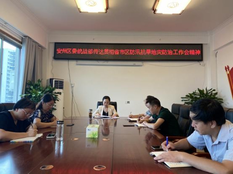 7月18日,安州区委统战部传达学习省市区防汛抗旱地灾工作会精神。区委常委、统战部部长蔡晓玲主持,全体干部职工参加会议。