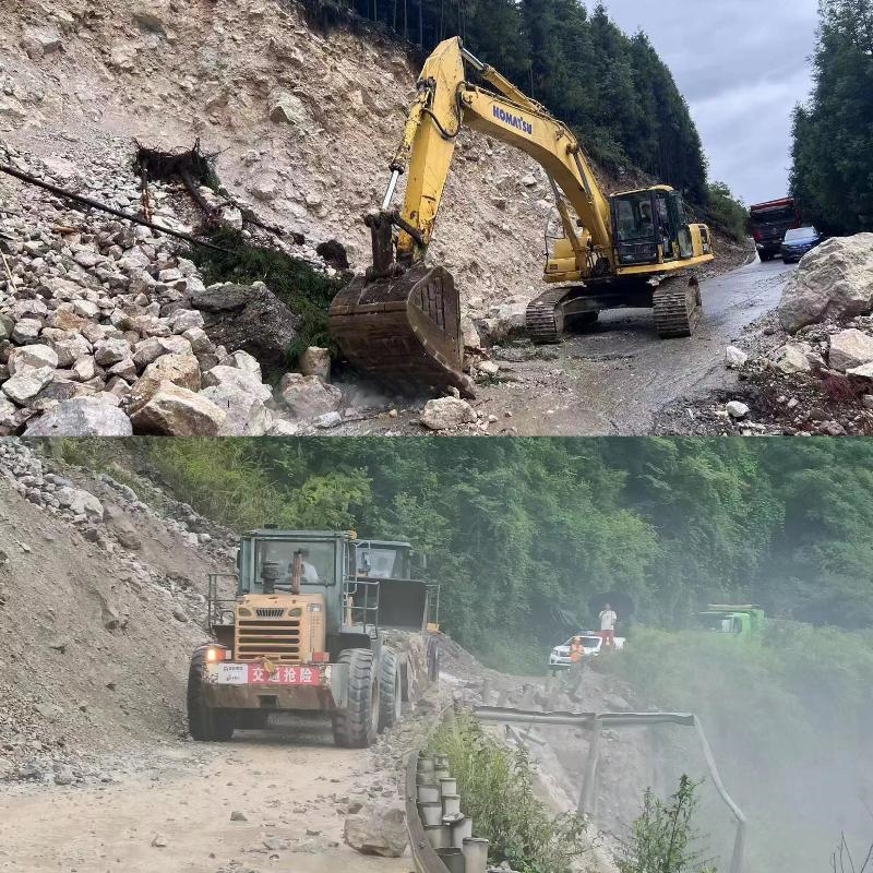 高川商会组织机械清理道路、清理石钟滩塌方