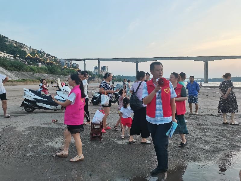 “最近天气炎热,一定不要私自去河边或池塘边玩耍。”7月15日清晨,致公党纳溪基层委党员和纳溪区安富街道上坝社区干部像往常一样来到滨江路,用“小喇叭”进行防溺水宣传,减少溺水事故的发生。盛夏时节,气温逐渐升高,市民涉水、游泳行为增多。连日来,致公党纳溪基层委和安富街道上坝社区在滨江路联合开展“防溺水-安全行”安全宣传志愿服务活动,通过“小喇叭”提醒、发放宣传单、案例讲解等方式,向消暑纳凉群众宣传讲解防溺水安全知识和溺水自救技能,同时发现孩子有去河玩耍的意向和行动立即进行劝导,织密织牢防溺水“安全网”。