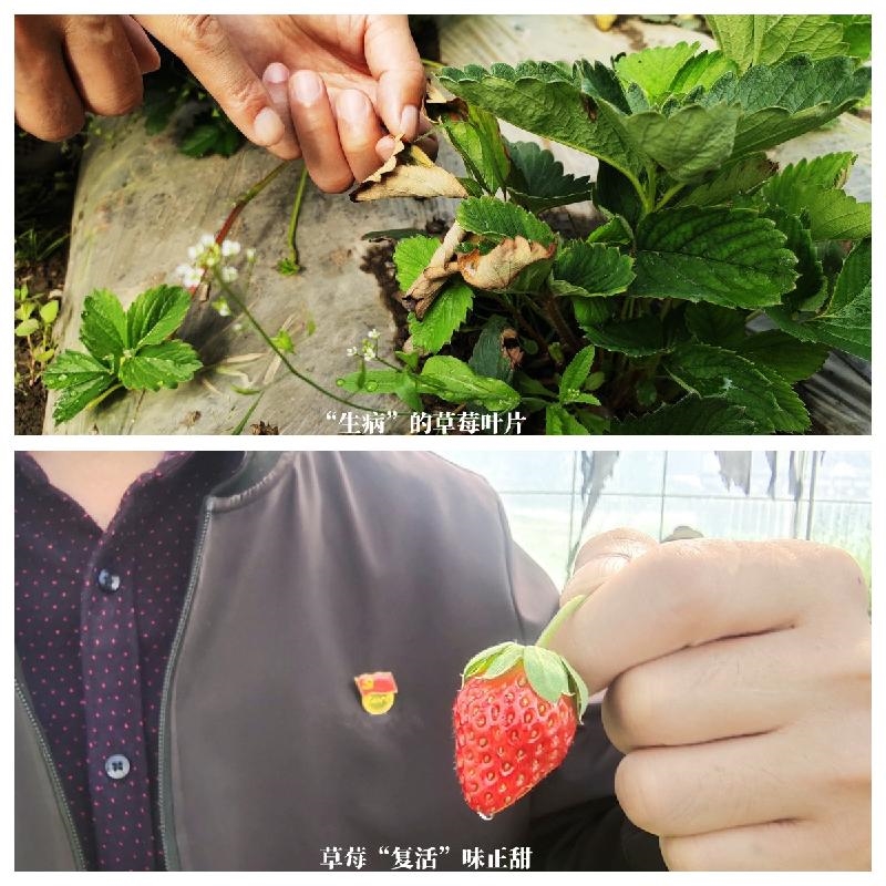 八天以前,段彬陪同香格里拉镇党委书记格桑尼玛、政法委员兰克到瓦龙村上督导值班值守工作情况时收到反映,村里大棚里种植的草莓出现了大面积病虫害。出于专业敏感性,段彬立即到大棚现场查勘,通过与管理人员交流分析,发现是当前大棚的种植方法和田间管理出了差错,并不是“病虫害”。高原,紫外线很强,大棚保温性好,导致草莓叶片承受不住高温而“烧黄”。查明原因后,段彬指导管理人员立即进行了现场喷淋滴管处理。