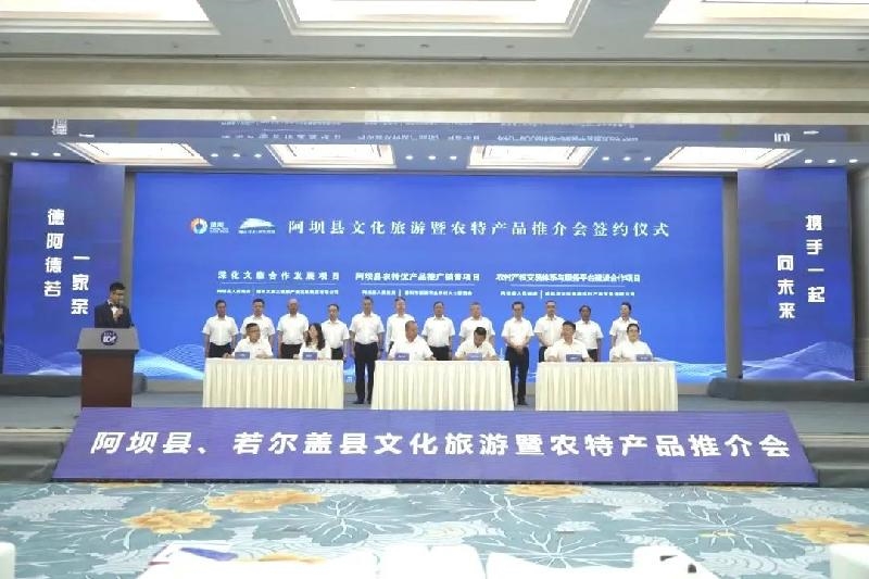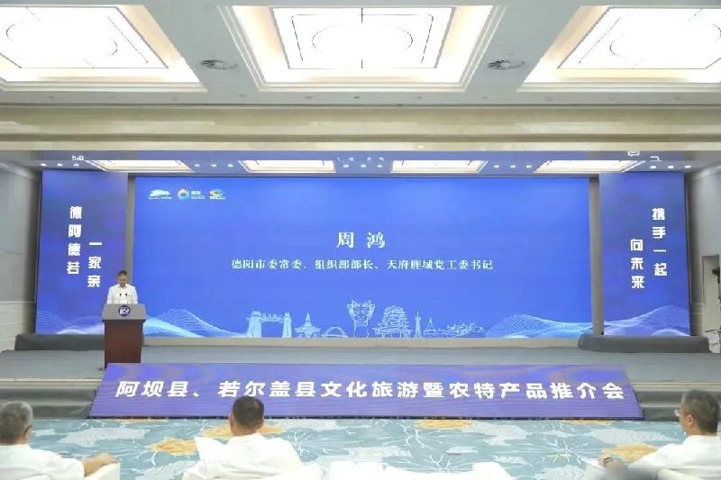 7月18日上午,阿坝州阿坝县、若尔盖县文化旅游暨农特产品推介会在德阳举行。德阳市委常委、组织部部长、天府旌城党工委书记周鸿出席并致辞。副市长卿伟,市政协副主席、市对口帮扶若尔盖县前方总指挥长陈若愚,市对口帮扶阿坝县前方总指挥长俞伟,市对口帮扶彝区县前方总指挥长靳钊军,阿坝州政协副主席、阿坝县委书记冯峥勇,若尔盖县委书记刘飞出席。
