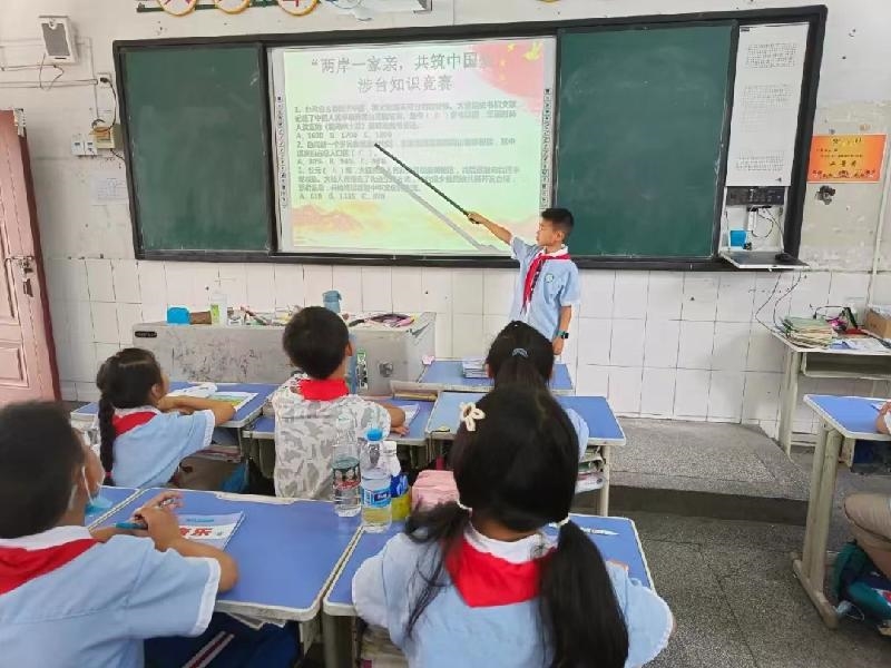在大竹县第六小学,整个校园渲染成了涉台知识“寻宝问答”的舞台,同学们通过各种游戏、知识竞赛、橱窗展板等载体,进一步增进对祖国宝岛台湾的了解。同时,各班还举办了“乡愁是一枚小小的邮票”主题诗歌朗诵会,同学们在温暖深情的诵读中,深切地感受着一衣带水的骨肉相思和两岸人民盼统一的浓浓真情。
