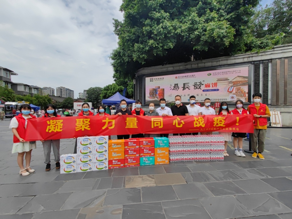 8月2日,在宽窄巷子社区宽窄巷子东广场核酸检测点,金沙支社主委陈其品一行送上牛奶、矿泉水、方便面等防疫慰问物资,为依旧坚守在疫情防控岗位的工作人员带去一份关怀,向奋战在疫情防控第一线的志愿工作者表示崇高敬意。