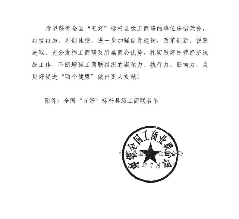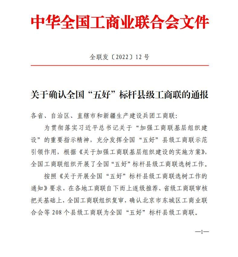 近日,中华全国工商业联合会发布《关于确认全国“五好”标杆县级工商联的通报》(全联发〔2022〕12号),翠屏区工商联喜获首批全国“五好”标杆县级工商联。