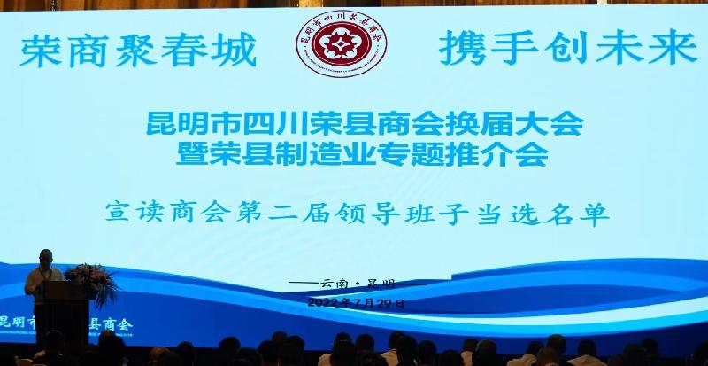 近日,昆明市四川荣县商会换届大会暨荣县制造业专题推介会在昆明市世纪金源大饭店举行。自贡市工商联副主席、市总商会副会长郭建红,荣县县委常委、统战部部长胡爱华,荣县人大常委会副主任张伟红,荣县政府副县长虞芳,荣县政协副主席代少书,昆明市投资促进局调研员赵勇等领导出席大会。部分在滇工作的荣县籍各界优秀人士,荣县各异地商会代表,云南省、昆明市各友好商会代表,以及荣县县委统战部、县工商联、县投促局等部门代表和昆明市四川荣县商会会员等200余人参加会议,共同见证大会胜利召开。