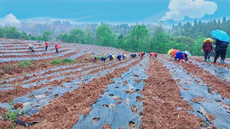 内江市东兴区永福镇鲤鱼塘村天冬产业园区里,一片忙碌的景象,村干部、志愿者和村民正忙着清扫杂草,播下天冬种苗。