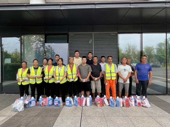 会员代表为面对连续高温天气依然坚守岗位现场的环卫工人们分发了装有毛巾、洗衣液、肥皂、保温杯、藿香正气水等物品的“大礼包”。让他们在炎炎烈日中感受到来自社会的关爱。