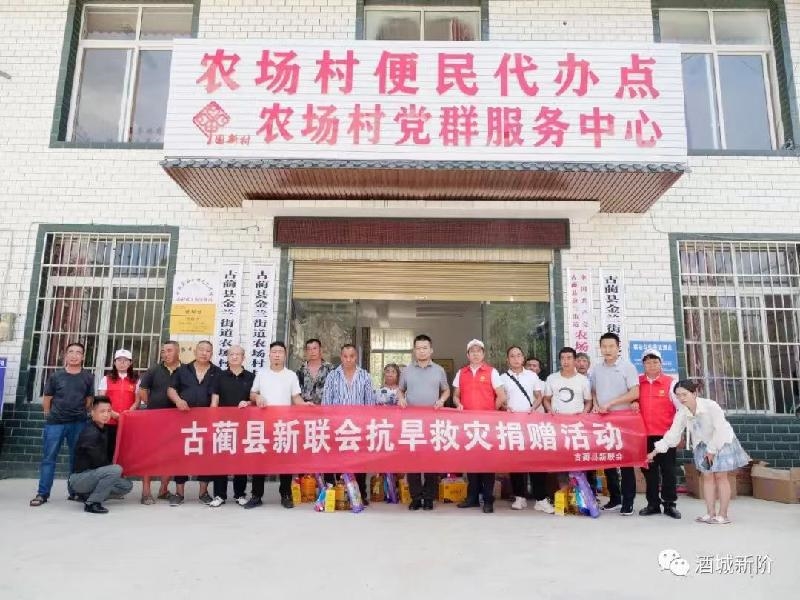 今年7月以来,古蔺县遭受60年不遇的高温干旱,旱灾造成粮食和经济作物大面积受损,给群众生产生活造成了极大影响。古蔺新阶人士迅速做出反应、积极筹集物资,为农场村30户因干旱而严重影响生产生活的农户捐赠了生活物资,为天堂村捐赠了抗旱专项资金5000元。