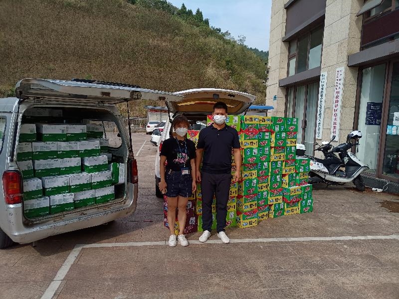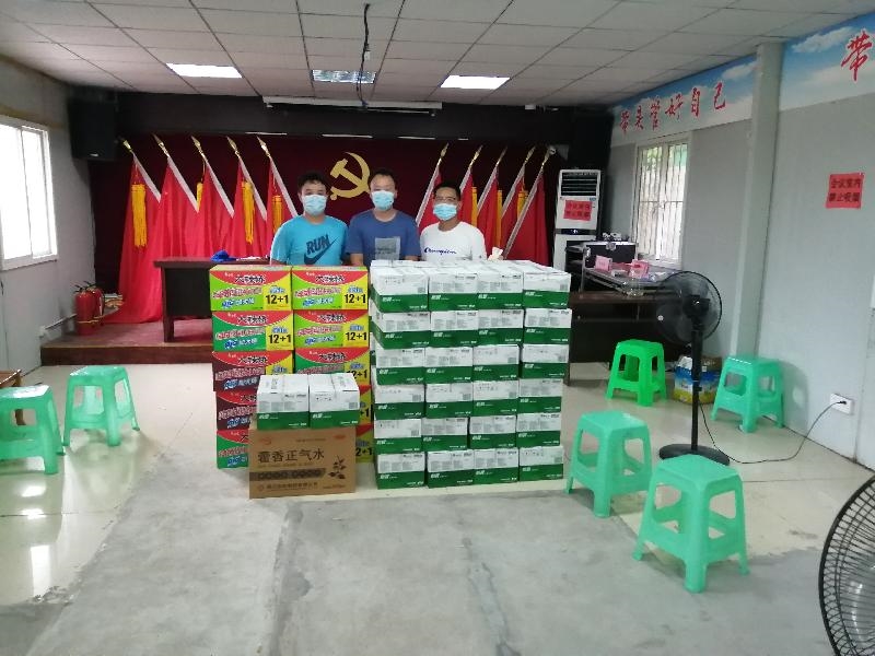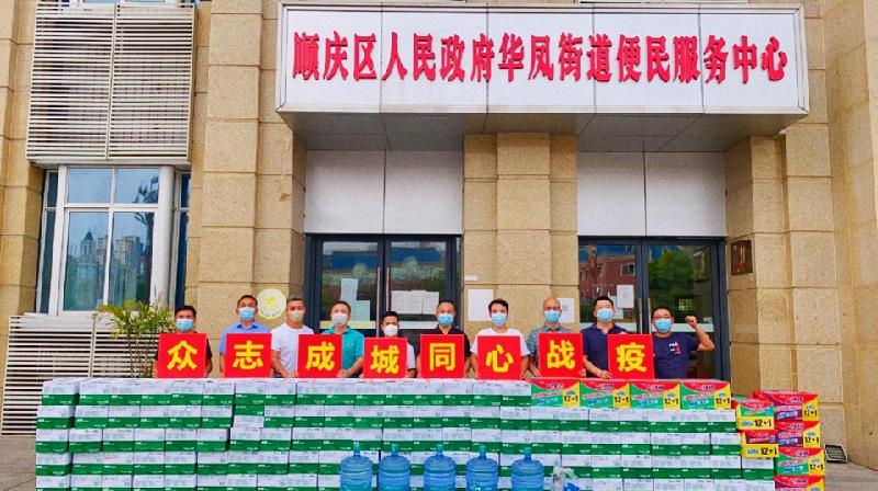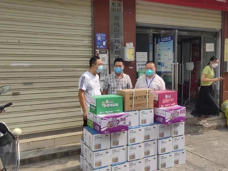 在何家观社区,民建顺庆工商支部向社区捐赠矿泉水、方便面、口罩、藿香正气水等物资。