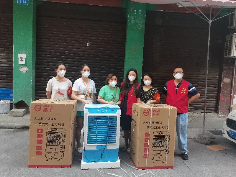在稻香路社区,为帮助现场医务人员和工作人员缓解高温压力,在九三学社副主委肖冬的倡议下,该疫情防控小分队一致同意向社区捐赠3台冷风机,在炎炎夏日,为一线防疫人员送去一丝清凉。