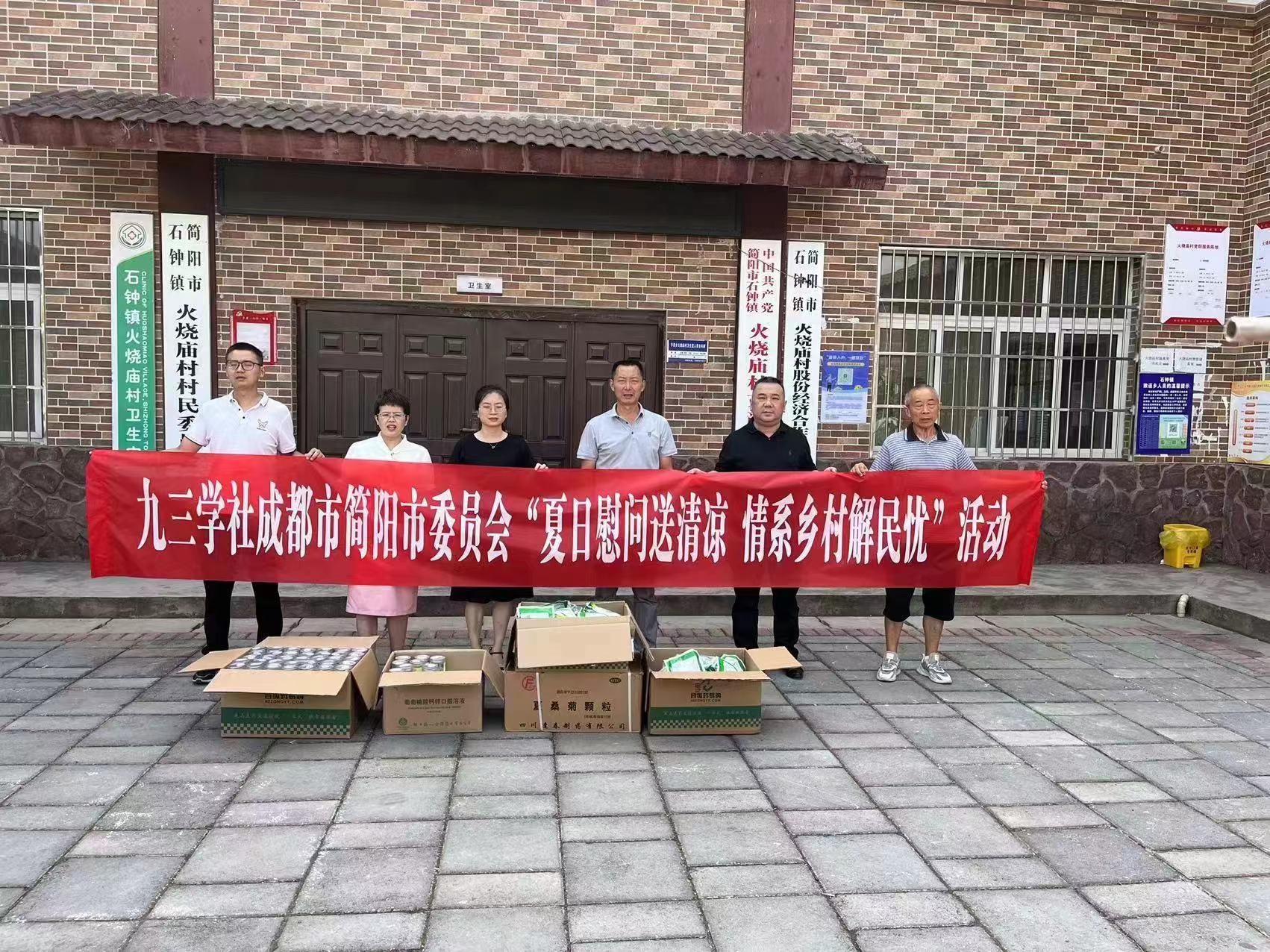 入夏以来,简阳市多次创造有气象记录以来的最高温,给一线农民生产生活带来了较大困难。为切实保障村民身体健康,确保玉米、水稻等农作物秋收正常开展,8月26日,九三学社成都市简阳市委员会班子吴森洋、叶世富、张忻怡、徐丽英等到石钟镇火烧庙村开展“夏日慰问送清凉 情系乡村解民忧”活动,捐赠藿香正气液、夏桑菊、金银花等解暑药品物品,慰问驻村队员,充分展现九三学社成都市简阳市委员会的社会责任担当。
