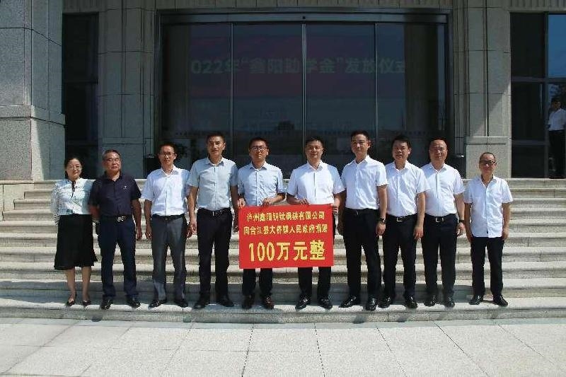 仪式上,落户大桥镇的民营企业泸州鑫阳钒钛钢铁有限公司向大桥镇人民政府捐赠100万元设立“100万鑫阳基金”,用于关爱孤残、捐资助学、乡村振兴、基础设施建设等公益活动,并向382名大桥籍优秀学子发放“100万鑫阳基金”助学金共计9.6万元。