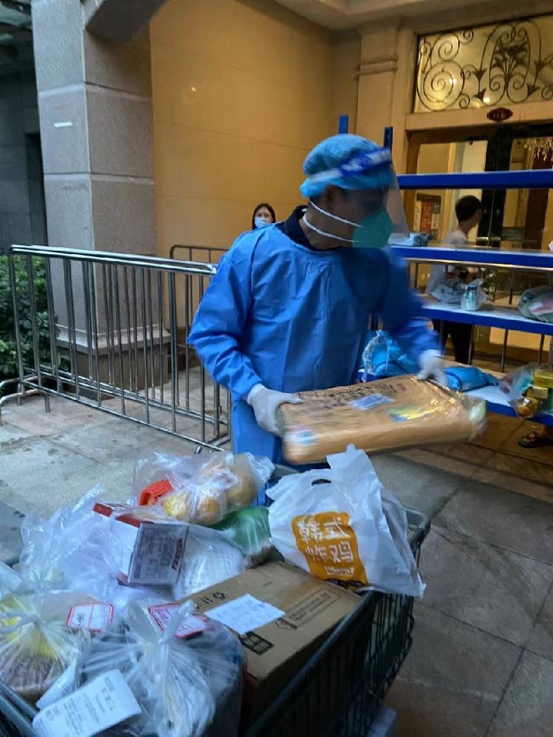 穿上厚厚的防护服,戴上严实的医用口罩、隔离面罩,李潇逸与公司志愿者一起开始了居民物资的运送。自小区封闭管理以来,小区居民从外界购买的大量生活物资只能由志愿者进行转运。物资转运结束后来不及长时间休息,李潇逸和同事又投入到了协助核酸检测的队伍。作为集团派往支援点位协助疫情防控的负责人,全市居家管理的这几天李潇逸一直在支援点位上部署并投身志愿服务工作,为封控区的防疫工作贡献了同心力量。