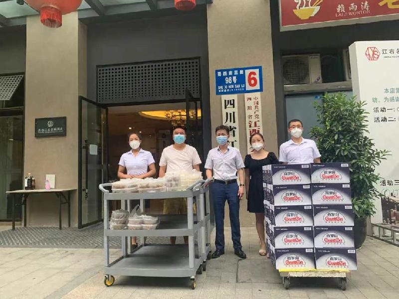 金牛区南昌县商会会员企业成都江右名商酒店为一线抗疫的医护人员和志愿者制作盒饭百余份,向金泉街道蜀西社区捐赠矿泉水60箱。