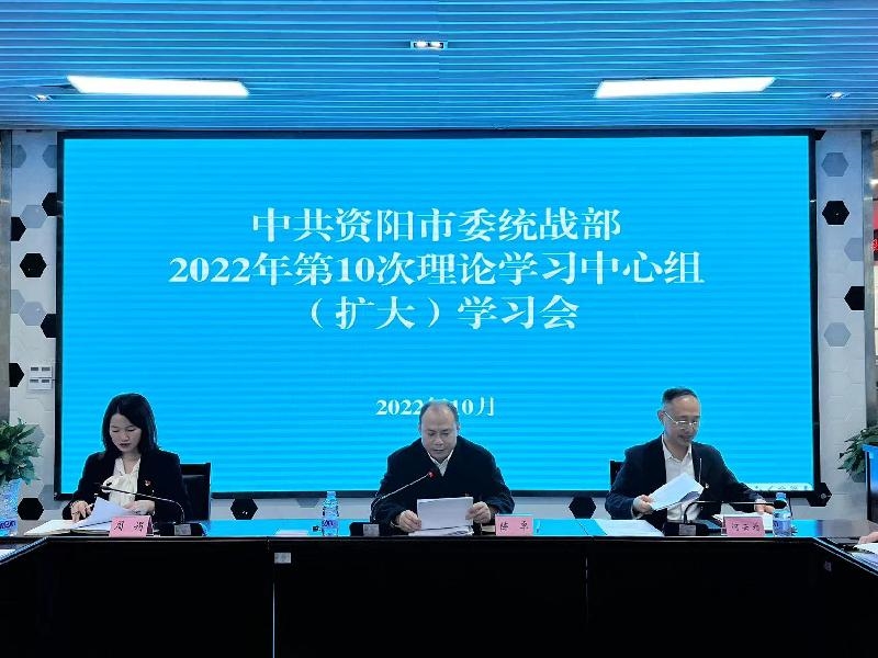 10月28日,资阳市委统战部召开理论学习中心组(扩大)会议,传达学习党的二十大和二十届一中全会精神,部机关全体党员干部参加会议,中心组成员和部分党员代表作交流发言。