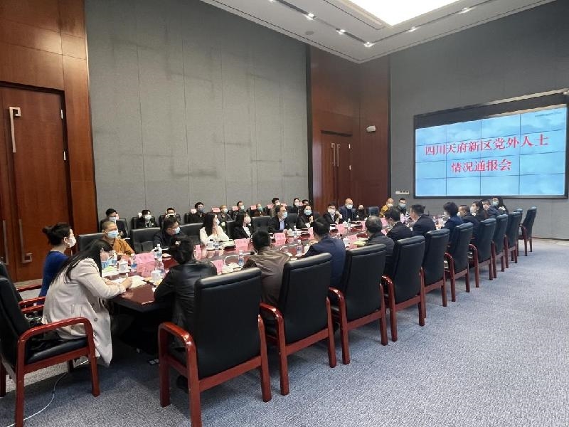 党外人士情况通报会上,彭天宇传达学习党的二十大及四川省、成都市、新区有关会议精神,通报中央、省委、市委党外人士情况通报会精神,并介绍四川天府新区的规划建设、对外开放、交通运输、科技创新等方面的情况,分享天府新区发展机遇。