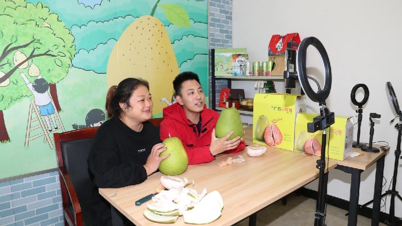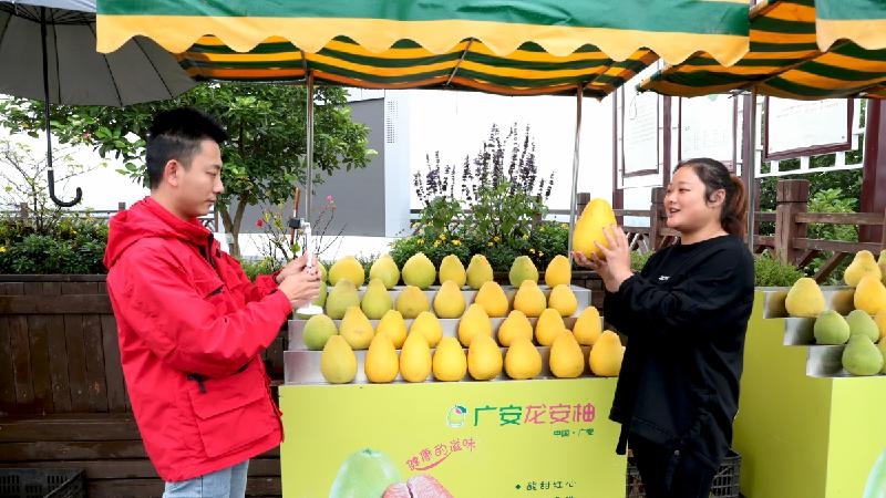 11月7日,在广安区龙安乡革新村电商服务站,乡贤杨红梅正在大显身手直播带货龙安柚,助力缓解龙安柚销售难题。
