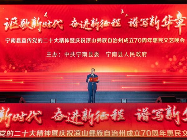 王显晖在致辞中代表县四大班子向莅临晚会的领导、嘉宾表示热烈的欢迎,向全县父老乡亲和所有关心支持宁南发展的社会各界人士表示衷心的感谢。他指出,70年来,宁南在州委、州政府的坚强领导下,团结带领全县各族人民自强不息、艰苦奋斗,书写了砥砺前行、跨越发展的恢宏篇章,取得了一个又一个进步,办成了一批又一批实事,打赢了一场又一场硬仗。全县上下要深入学习贯彻党的二十大精神,始终保持专注发展定力,全力以赴拼经济、搞建设,突出抓好项目建设、城镇提升、产业发展、安全稳定,用心用情办好教育、卫生等民生事业,让宁南发展更添风采活力,让宁南人民更加幸福美满!