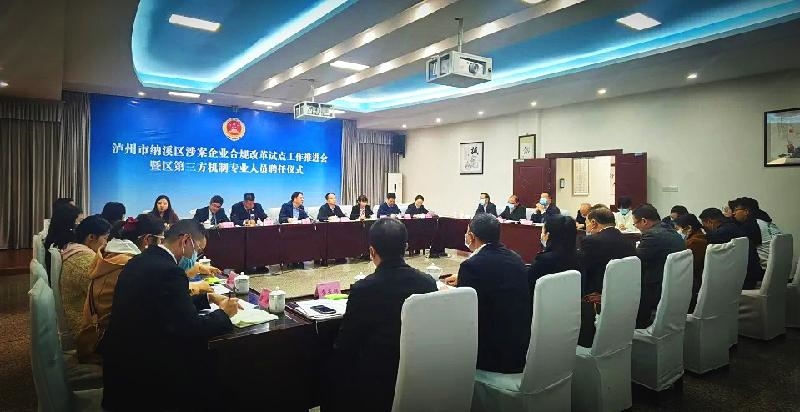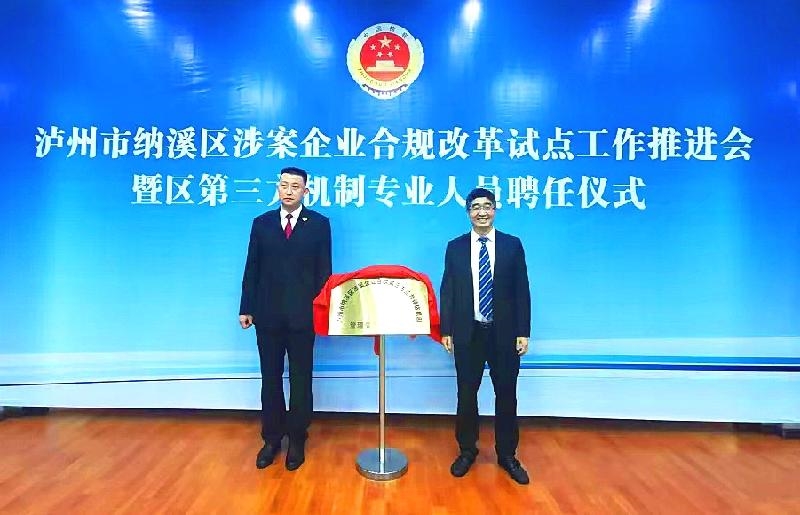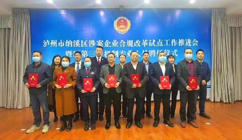 会议宣读《关于成立泸州市纳溪区涉案企业合规第三方监督评估机制管理委员会的通知》和《关于聘任泸州市纳溪区第三方监督评估机制第一批专业人员的决定》,并举行纳溪区第三方机制管委会办公室揭牌和为区第三方机制专业人员代表颁发聘书。