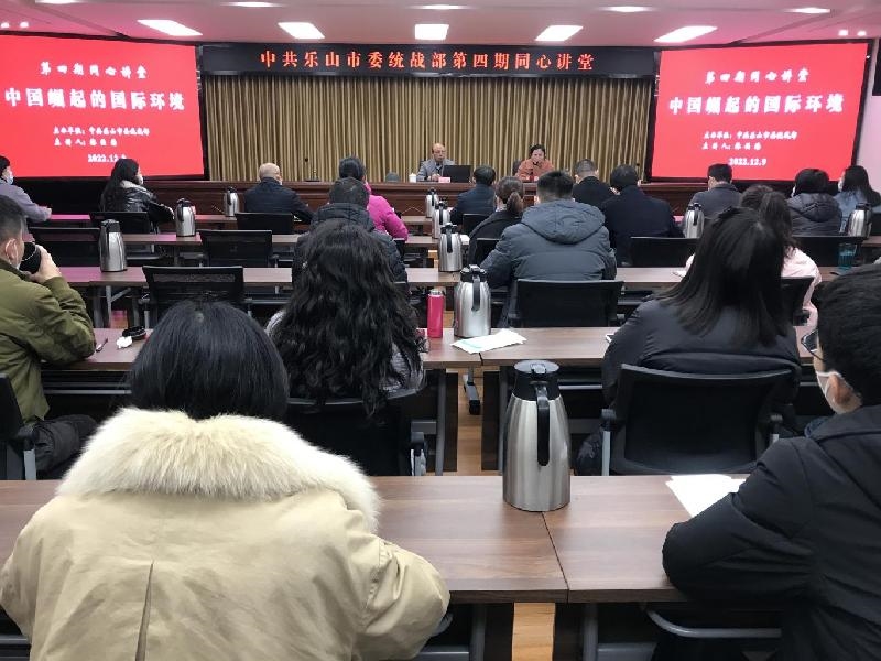 12月9日,乐山市委统战部2022年度第四期“同心讲堂”举行。讲堂邀请西南交通大学马克思主义学院教授,博士生导师林伯海讲授中国崛起的国际环境。市委统战部、市级各民主党派、市工商联机关干部参加,市委统战部机关党委书记任文杰主持。