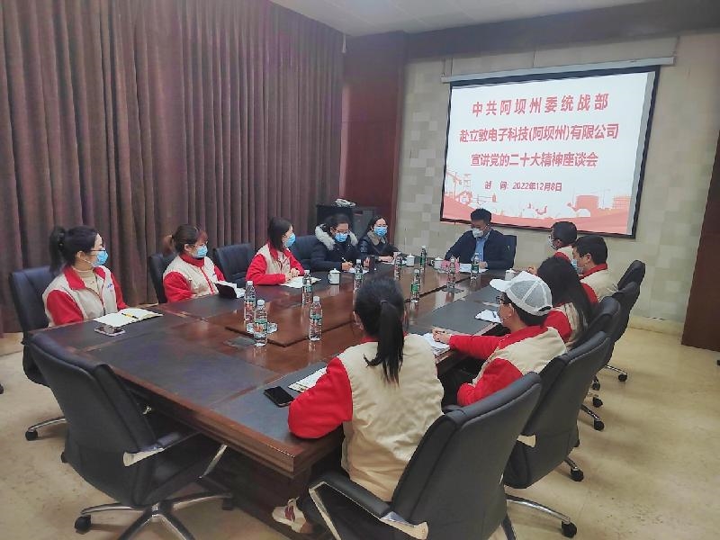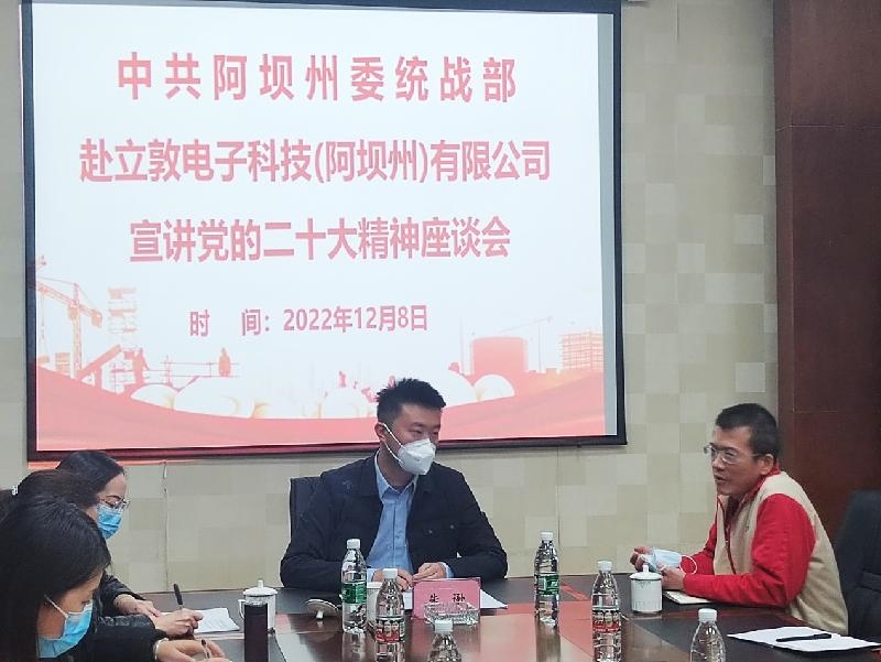 今年是两岸开启交流35周年,为进一步夯实对台交流合作基础,促进两岸和平发展、融合发展,不断铸牢中华民族共同体意识。12月8日,州委统战部副部长朱逊一行专程来到位于汶川县漩口镇工业园区的“川台融合发展突出贡献台资企业”——立敦电子科技(阿坝州)有限公司宣讲党的二十大精神,并与台胞及企业员工代表亲切座谈交流。