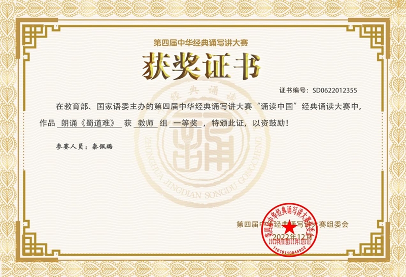 2023年1月12日,由教育部举办的第四届中华经典诵写讲大赛获奖名单揭晓,民建成都市宣传工作委员会委员、民建成都理工大学支部会员秦佩璐荣获“诵读中国”经典诵读大赛全国总决赛一等奖。