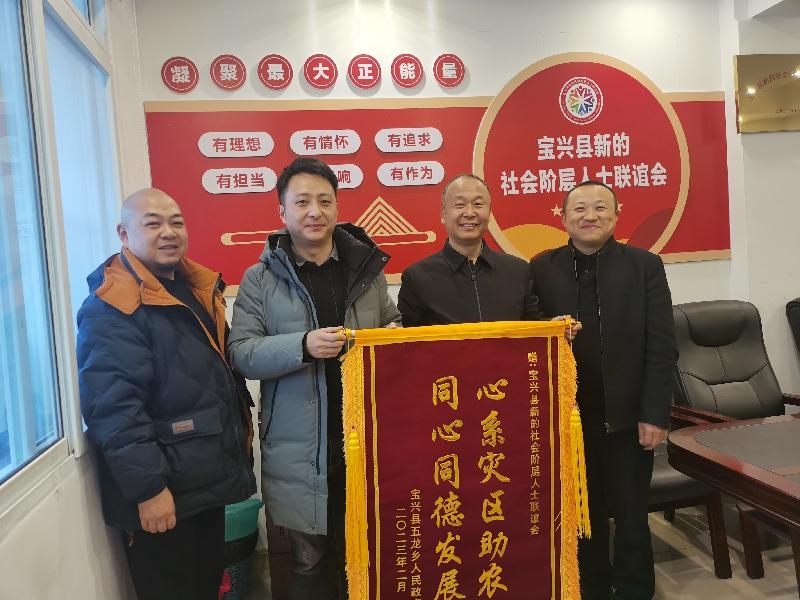 2023年2月14日,宝兴县委统战部会同五龙乡党委、乡人民政府领导来到宝兴县新的社会阶层人士联谊会,为新阶组织送上一面“心系灾区助农 同心同德发展”的锦旗。