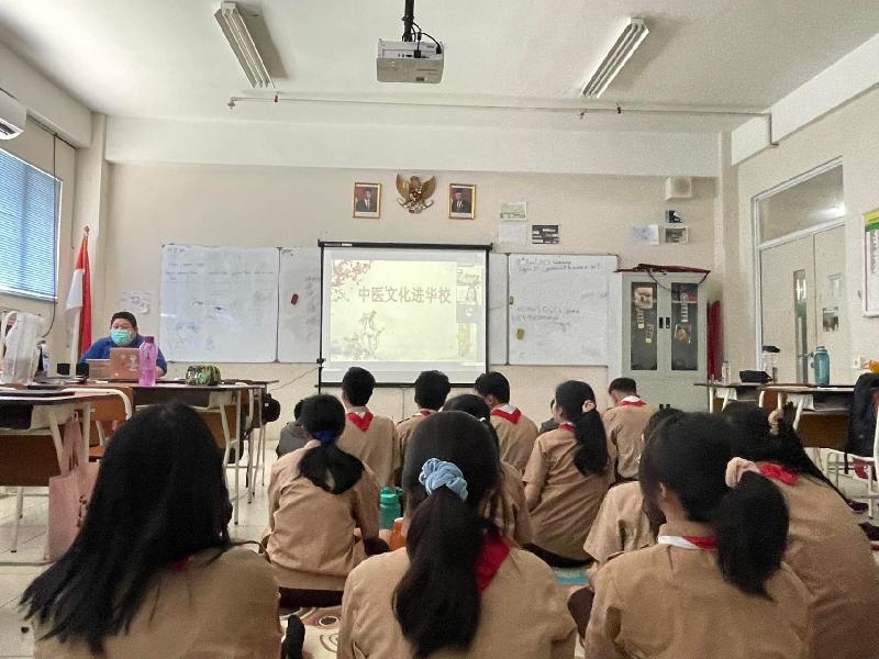 活动中,达州中医药职业学院的张银素老师以“良药苦口利于病”为切入点,引出神农尝百草的神话故事,向同学们介绍了身边常用的中草药。从美容养颜的珍珠到清肺止咳的枇杷叶,从养生药材枸杞子到治病救人的青蒿,她风趣幽默、深入浅出地讲述了中医中药的健康知识,传授了简单的中医药日常护理小妙招。最后,颜新婷老师通过视频示范教学、亲身示范等形式,带领同学们一起学习了中医养生操——八段锦,让印尼巴中三语学校的同学感受到了中医文化的博大精深和玄妙神奇,增强了华裔青少年对中医药的认识,提高了他们对中医药的浓厚兴趣,让他们更深入地感悟到了中国文化的无穷魅力,增强了他们对中国文化的认同感、亲近感。