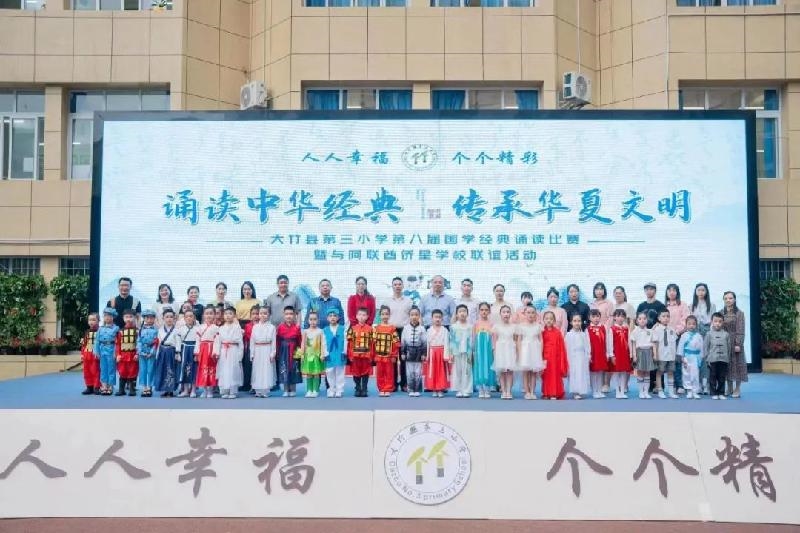 与书香为伴,携经典同行。为传播中华优秀传统文化,促进国际文化交流,提高学生阅读经典、品味经典的能力,近日,大竹县第三小学隆重举行“诵读中华经典,传承华夏文明”国学经典诵读比赛暨与阿联酋侨星学校联谊活动,这也是该校去年与阿联酋侨星学校成功结对后的首场联合演出。通过优美的音乐、富有激情的诵读、精彩纷呈的表演,为线上、线下观众奉献了一场经典的文化视听盛宴。大竹县委统战部常务副部长、台办主任、侨务办主任李晓庆应邀出席,县教育局、县侨联等部门(单位)相关负责同志参加活动。