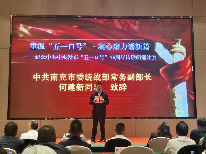 今年是中共中央发布“五一口号”75周年,为纪念这一重要历史事件,引导各民主党派、无党派人士重温多党合作历史,弘扬优良传统,进一步巩固共同奋斗的思想政治基础,团结各民主党派、无党派人士积极投身现代化南充建设,4月27日下午,由市委统战部主办的“重温‘五一口号’凝心聚力谱新篇”诗歌朗诵比赛在金鸿大酒店举行。