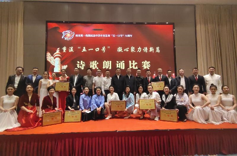 据了解,今天举办的诗歌朗诵比赛,是全市统一战线纪念中共中央发布“五一口号”75周年“六个一”系列活动之一,即:一次纪念座谈会、一次专题培训、一次主题征文活动、一次考察调研、一次诗歌朗诵比赛、一次微视频征集。