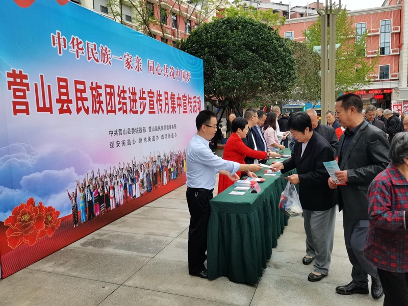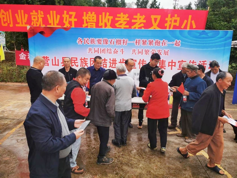 活动现场,通过悬挂横幅、张贴海报,发放《四川省民族团结进步条例》政策读本、铸牢中华民族共同体意识宣传折页等方式,向县内各族群众普及民族团结进步政策知识,讲述营山民族优秀文化、传播营山团结奋进故事。