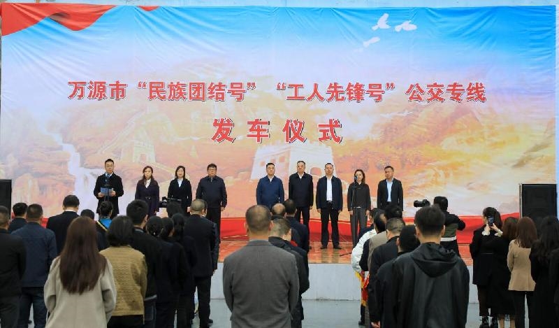 11月3日,万源市举行“民族团结号”公交专线发车仪式。万源市委常委、统战部部长,市总工会主席李强出席仪式并宣布发车,市政府副市长、市公安局局长闵军舰致辞。市委统战部、市人大社建委、市政协社法群委、市总工会、市交运局相关负责人,统一战线代表人士、少数民族群众代表、居民代表等60余人参加活动。