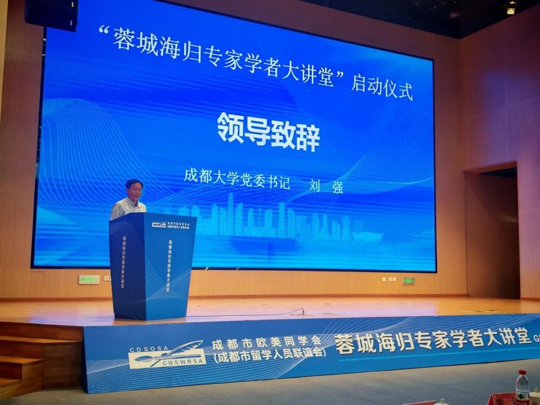 刘强在致辞中表示,海归人才是连接中国与世界的纽带,是推动科技自立自强的先锋力量。成都大学高度重视留学人员工作,成立学校欧美同学会,联合市欧美同学会共建“蓉归同心 大成天府”成都留学人员服务体验馆,充分发挥留学人员优势作用,为学科建设、科研创新和国际化发展做出了积极贡献。“蓉城海归专家学者大讲堂”将融合学术、产业与政策资源,为海内外高层次人才搭建思想碰撞的桥梁,为青年学子打开国际视野的窗口,为城市发展注入创新驱动的澎湃动能。成都大学将充分发挥学科交叉优势,依托大讲堂、斯特灵学院、海外教育学院等国际化平台,推动海归人才与本土团队深度融合,加速科技成果从实验室走向生产线,从书架跃向货架。