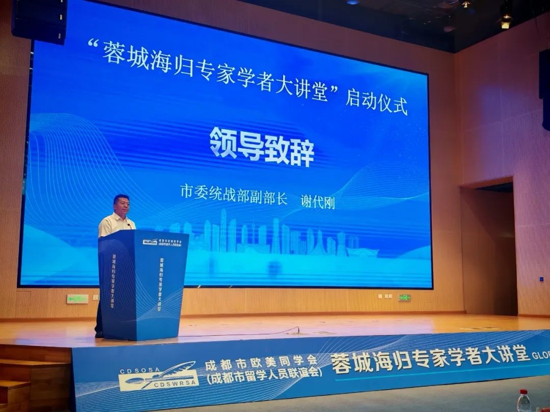 谢代刚在致辞中表示,“蓉城海归专家学者大讲堂”是成都市欧美同学会“海归·蓉城”总品牌体系的又一全新载体,是精准引领海归人才,高效激发海归智慧,服务蓉城高质量发展的重要平台。希望市欧美同学会始终聚焦市委决策部署、城市发展所需,主动寻找场景,精心设计讲题,要让讲堂走进学校、园区、企事业等单位,帮助广大青少年提升文化知识、科技素养和创新能力,促进产学研用深度融合,催生更多创新成果和创业项目转化落地,聚力把讲堂打造为知识传播的新高地、人才成长的新摇篮、创新驱动的新引擎。希望广大海归专家学者大力弘扬留学报国光荣传统,充分发挥自身专业优势和国际视野,以讲堂为媒,精准把脉、科学开方、发表真知灼见、讲好成都故事,助推科技自立自强、服务城市改革发展、促进国际交流合作。希望各有关单位尤其是统战部门要强化支持保障,积极融入讲堂,加强联动,形成合力,通过讲堂广泛促进产学研用合作、创新创业合作、人才项目合作,不断拓展讲堂的功能、实效和影响力。