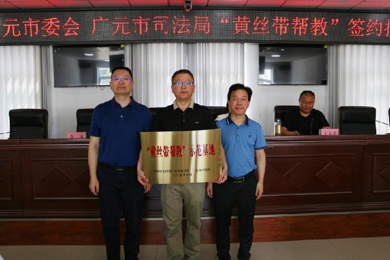 在旺苍县社区矫正中心,民盟广元市委会副主委李勇与广元市司法局副局长杨建军签订了《“黄丝带帮教”合作共建协议》,明确了各方在帮教工作中的职责与义务,共同为“黄丝带帮教”示范基地授牌。