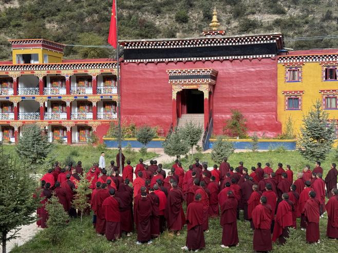 色达五明佛学院以“升国旗、学思想、话担当”为主题,深入开展升旗仪式、主题宣讲、走访交流三项活动。由7个石榴籽工作室牵头,组织90名干部开展全覆盖联谊走访活动,通过入僧舍、解诉求、讲政策,进一步营造干僧一心、喜迎国庆的浓厚氛围。