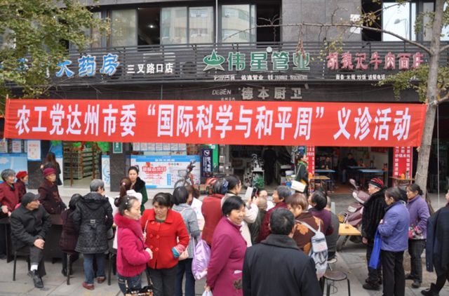 11月20日,达州市政协副主席、农工党达州市委主委李国友带领农工党医务专家前往达川区西环路开展“国际科学与和平周”义诊活动。 活动组织达州市中心医院、通川区中医院、达县人民医院、达川区妇幼保健院的农工党医卫专家参加义诊,为群众细心检查,提供健康咨询,向群众免费发放药品和计生用品价值1.2万余元,500多人在活动中受益。
