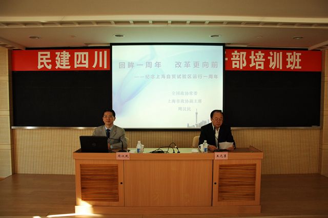 11月15日,民建中央副主席、全国政协常委、上海市政协副主席、上海市社会主义学院院长周汉民还在百忙之中抽出时间为学员授课。他以生动的语言、丰富的经历、鲜活的案例、翔实的数据讲授了《回眸一周年,改革更向前——纪念上海自贸试验区运行一周年》。他还就促进四川开放,做好参政议政、建言献策工作进行指导。
