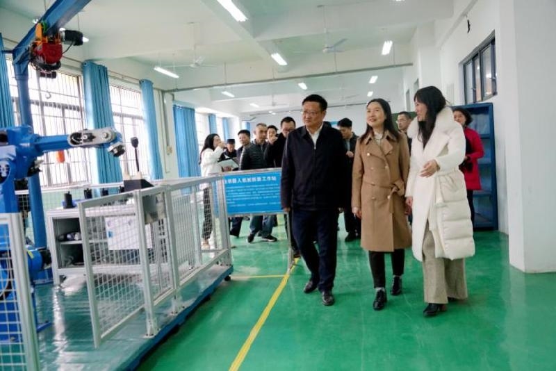 黎萍一行先后参观了南充职业技术学院土木与建筑工程系建筑工程虚拟仿真实训中心、电子信息工程系数字媒体实训室、机电工程系智能制造产线实训室和工业机器人码跺应用工作站,听取了工作人员现场讲解。