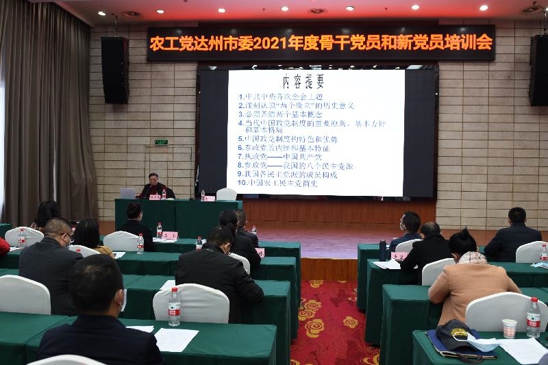 2021年12月13日,农工党达州市委在华夏康年大酒店举办2021年度骨干党员和新党员培训会。市政协副主席、农工党达州市委主委蒲春天出席会议并讲话。农工党达州市委副主委由何俊主持会议。
