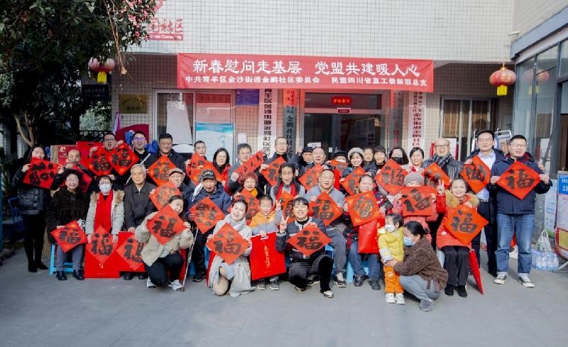 1月13日,民盟省直工委新联总支与中共青羊区金沙街道金鹏社区委员会联合开展“新春慰问走基层,党盟共建暖人心”主题慰问活动。总支主委李梅,副主委黄金伟、张宾带领盟员代表走进成都市青羊区金沙街道金鹏社区,为困难群众送去新春祝福。