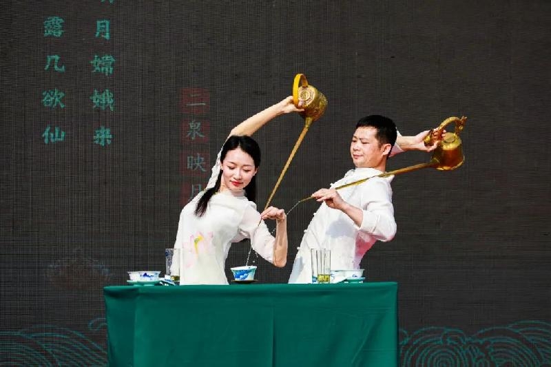 活动现场,沐川草龙翻腾助兴春茶采摘,来自成都市芙蓉门茶艺师表演了长嘴壶茶艺,沐川县中等职业学校师生表演了功夫茶艺,我县的三名茶艺师表演了宋代点茶。
