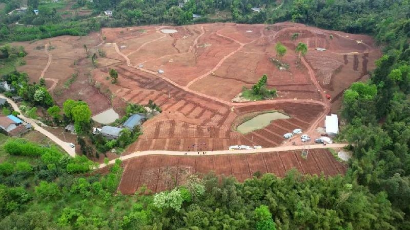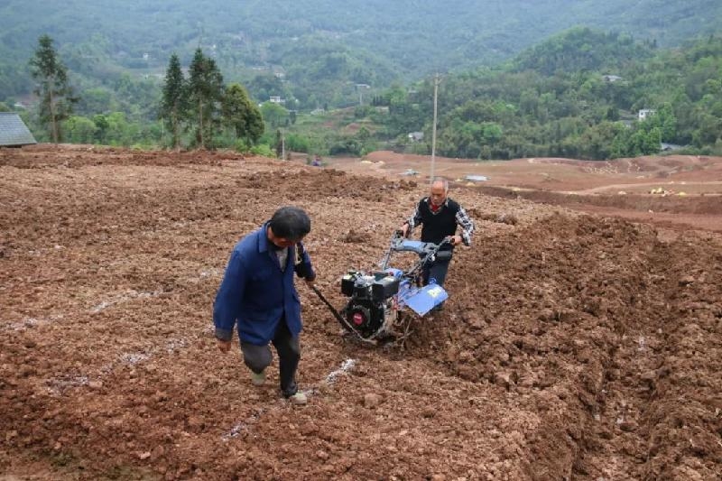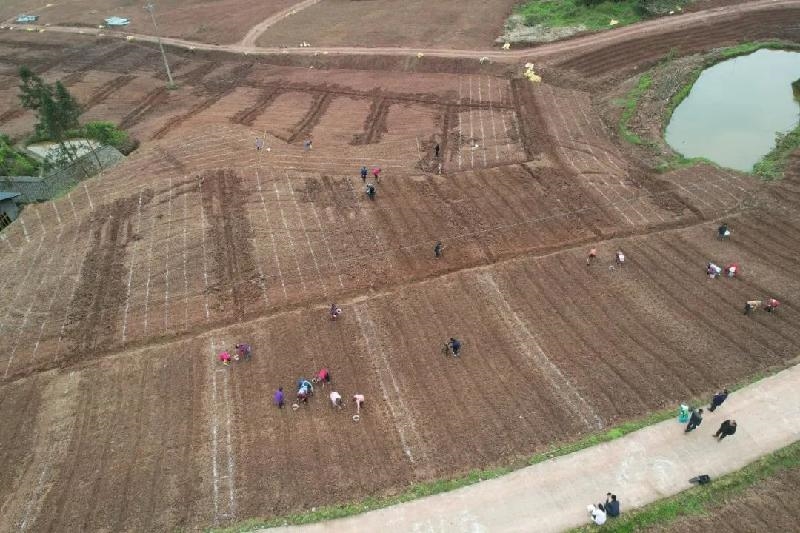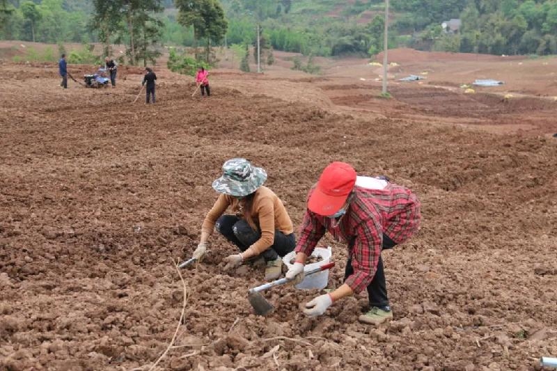 在沐溪镇共和村魔芋种植基地记者看到,250亩的土地经过整理后呈紫红色,登高远眺,连片规范的土地尽收眼底,颇为壮观。村民们操作农耕机具挖沟起垄,一垄垄经过翻耕的土地,在撒足底肥和杀菌后,30多名村民排成一列,手拿专用小锄头,一锄一颗播种魔芋种。连片平整的土地上,农耕机具来回耕作,村民躬身忙碌,构成一幅繁忙的春种农忙图。