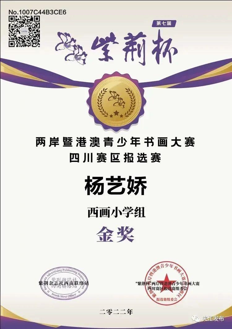 2019级3班学生杨艺娇的绘画作品《我的中国梦》荣获第七届“紫荆杯”两岸暨港澳青少年书画大赛四川赛区报选赛西画小学组“金奖”。