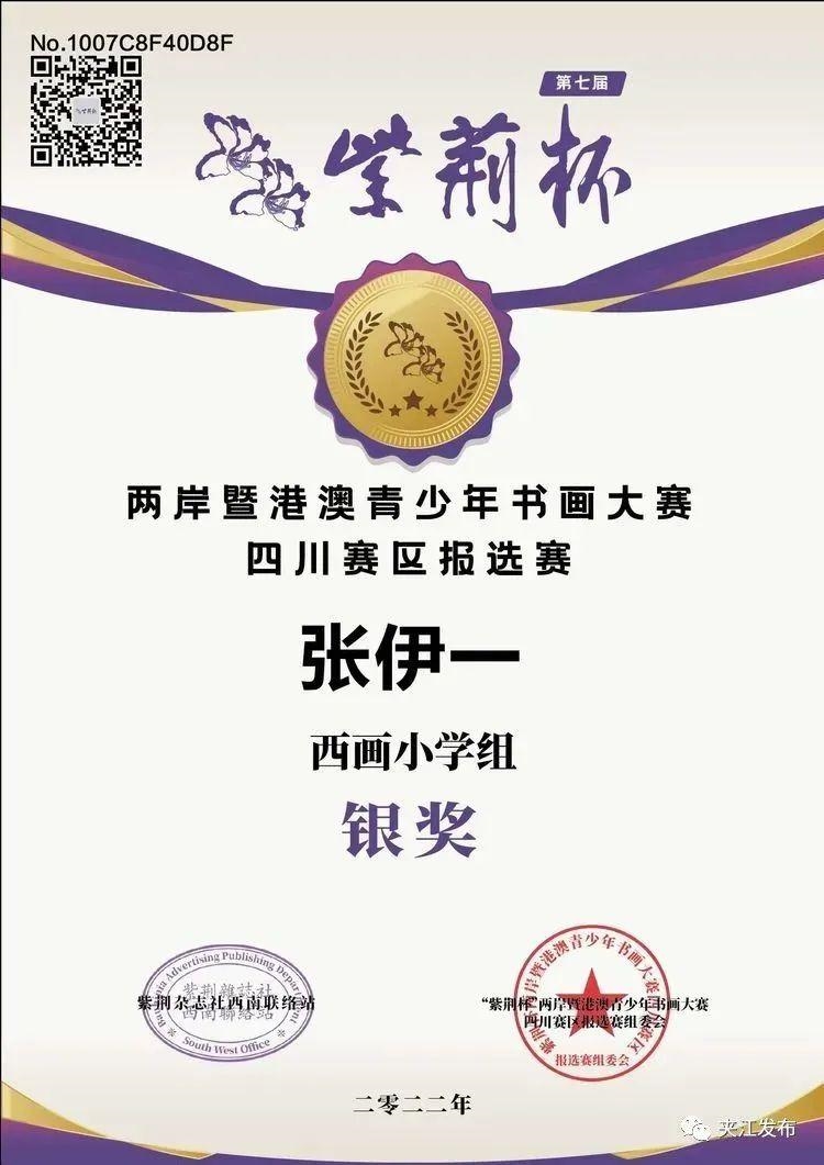 2019级4班学生张伊一的绘画作品《太空家园》荣获第七届“紫荆杯”两岸暨港澳青少年书画大赛四川赛区报选赛西画小学组“银奖”。