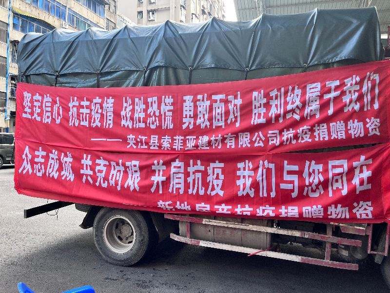 夹江县广乐陶瓷、汇丰陶瓷、索菲亚建材、新地房产捐赠价值24万元的防护服、口罩、消毒液、遮阳伞等防疫物资。