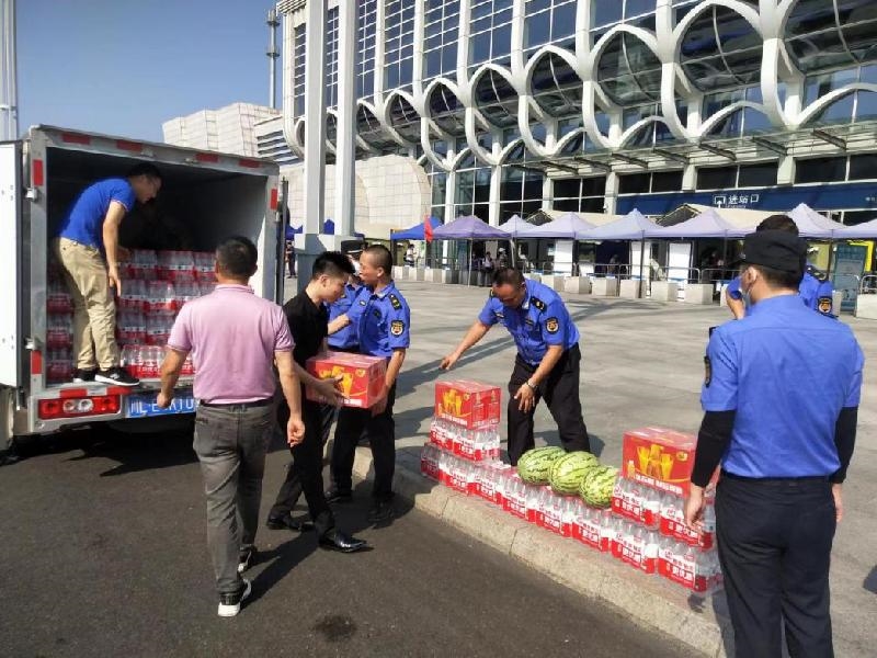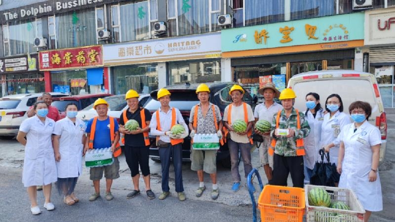 同日,机关总支会员企业、乐山市友谊医院也积极响应号召,组织工作人员为岷江二桥东岸桥头路段改建工地上的施工人员送去藿香正气合剂、矿泉水和西瓜,感谢他们为乐山城市建设的付出。施工队负责人表示:“这些清爽可口的西瓜、矿泉水,就像一阵阵凉风沁人心脾,让我们工作更有动力,更有信心战胜酷暑,争取早日完成改建任务。”