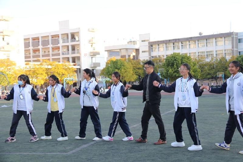 会后,与会人员与各族师生们在学校操场手拉手跳起了达体舞,独具特色的舞蹈、优美的旋律、欢快的笑声回荡在校园。