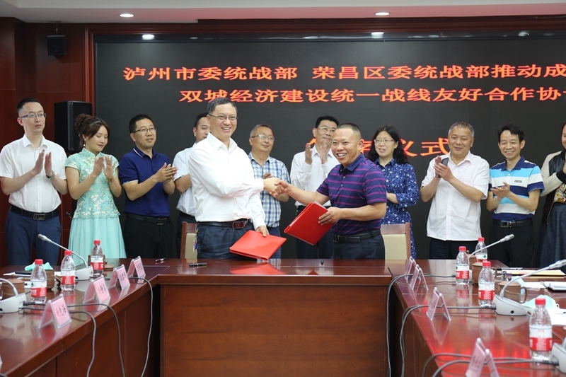 在荣昌区,考察团一行来到重庆唯美陶瓷有限公司(“一带一路”陶瓷博览园),现场考察学习荣昌区推动产业集群式、链条式发展的思路和举措。在随后召开的统一战线推动成渝地区双城经济圈建设交流座谈会上,双方分别介绍泸州市和荣昌区经济社会发展情况、统一战线有关情况及两地合作相关事项,并签署了《推动成渝地区双城经济圈建设统一战线友好合作协议》。